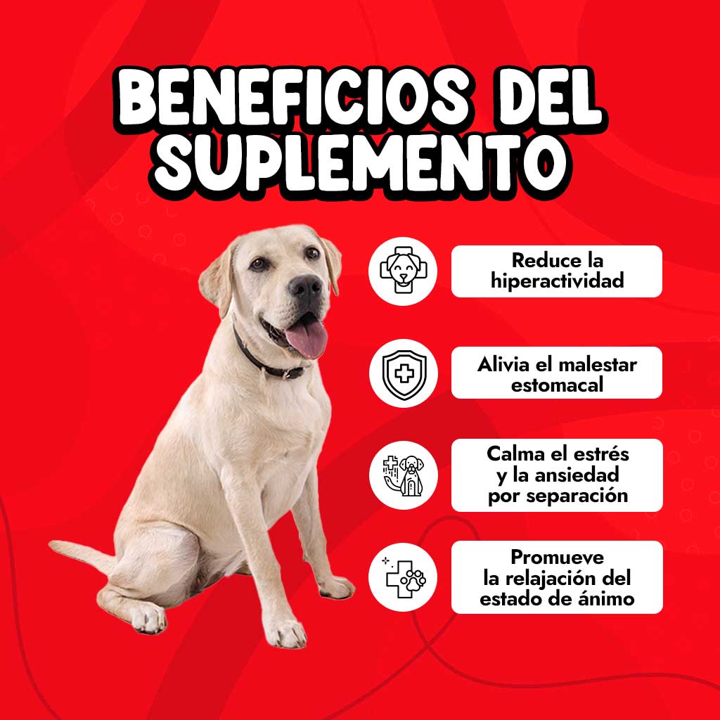 Este calmante natural para perros está formulado específicamente para aliviar el estrés y ansiedad que tu perro pueda sufrir. Funcionan mejor cuando se administran a diario en la dosis recomendada, pero también puede administrar una dosis normal justo antes de una situación estresante para ayudar a tu perro a mantener la calma.
